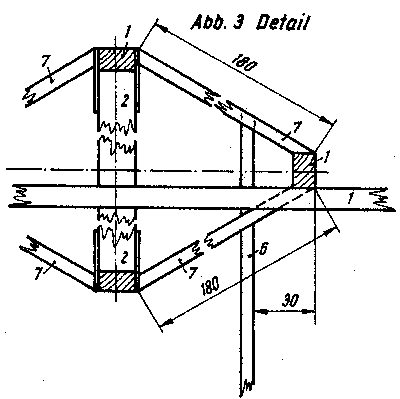 Zuerst stellen wir nach Abb. 1 den aufrechten Mittelrahmen des Rumpfes zusammen, wobei wir die 16 Stück 3x5mm Leisten Teil 7 mit einer Feile an den Enden so abschrägen, daß wir den Rumpf nach Abb. 2 bzw. 3 zusammenkleben können. So wie in Abb. 1 und 2 fügen wir die Tragflächenleisten ein und binden diese mit Zwirn und genügend Klebstoff (Duosan) fest an den Rumpf.