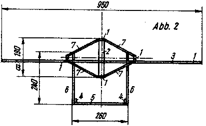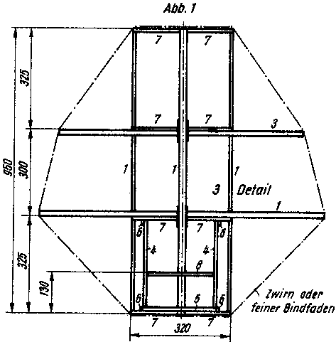 Zuerst stellen wir nach Abb. 1 den aufrechten Mittelrahmen des Rumpfes zusammen, wobei wir die 16 Stück 3x5mm Leisten Teil 7 mit einer Feile an den Enden so abschrägen, daß wir den Rumpf nach Abb. 2 bzw. 3 zusammenkleben können. So wie in Abb. 1 und 2 fügen wir die Tragflächenleisten ein und binden diese mit Zwirn und genügend Klebstoff (Duosan) fest an den Rumpf.