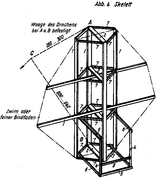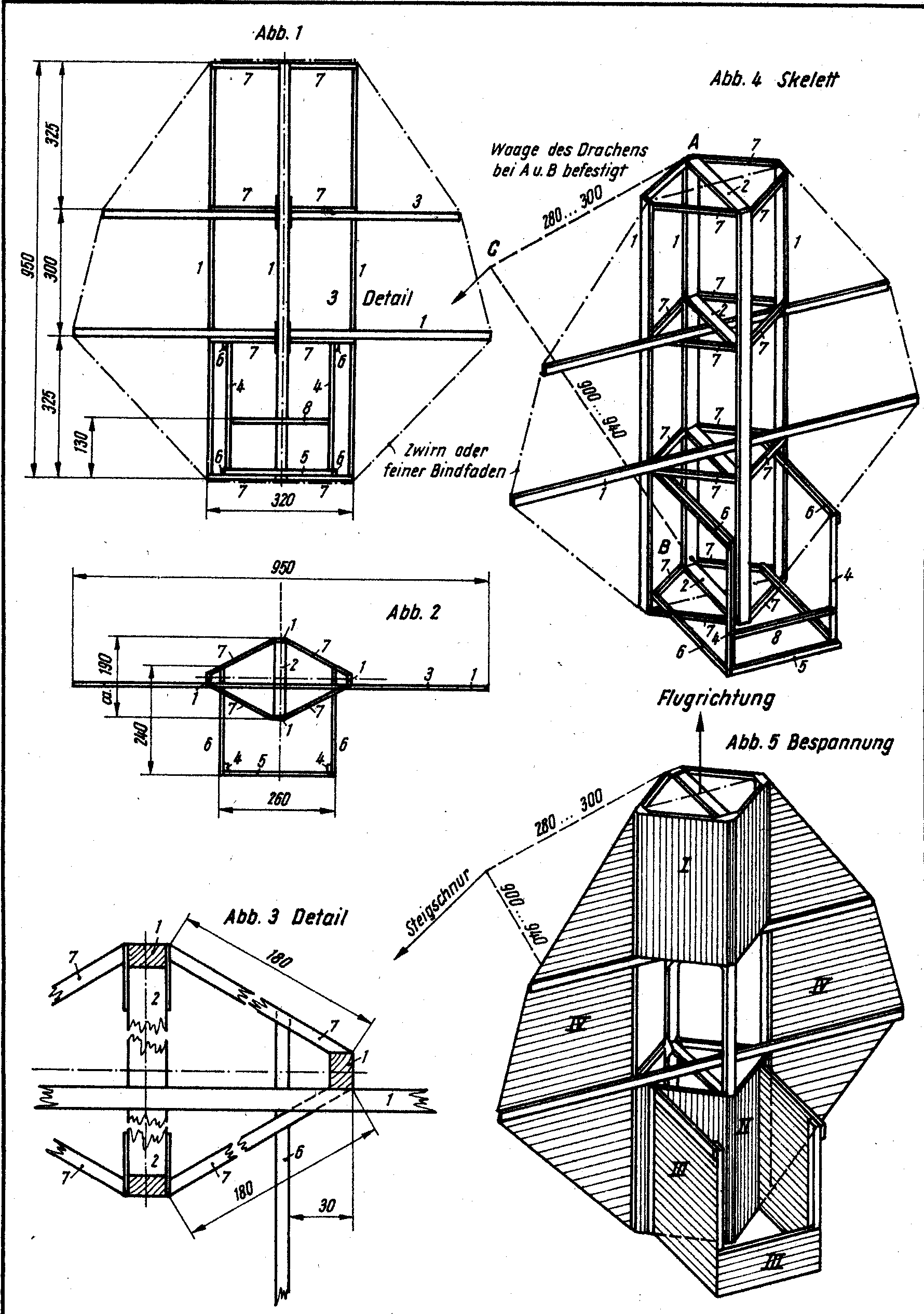 Ausgehend von diesen Erfolgen rufen wir alle Pioniere und FDJ-ler auf, uns im Kastendrachenbau oder anderen genannten Drachenformen nachzueifern. In den Fachgeschäften der HO "Der Bastlerfreund" werden ständig Leisten, Spannpapier, Spannlacke, fertige Bausätze und alle anderen notwendigen Materialien für die Modellbauer bereitgehalten. Wenn ihr alles besorgt habt, ist der Bau des nachfolgend beschriebenen Kastendrachens nicht mehr allzu schwer.
