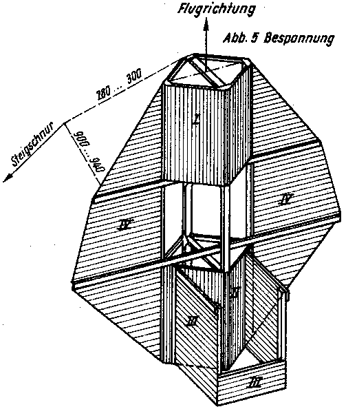 Zuletzt wird der Drachen mit Spannpapier überzogen, zuerst das obere Drittel, Fläche I, dann das untere Drittel, Fläche II, anschließend die Flächen des Leitwerkes, Fläche III und zuletzt die Tragfläche, Flächen IV, Abb. 5. Die Maße der Abbildungen sind in mm angegeben.